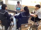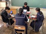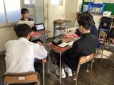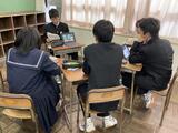 班ごとに分かれてタブレットで作成した資料を使って発表を行い、発表した人は班のメンバーから